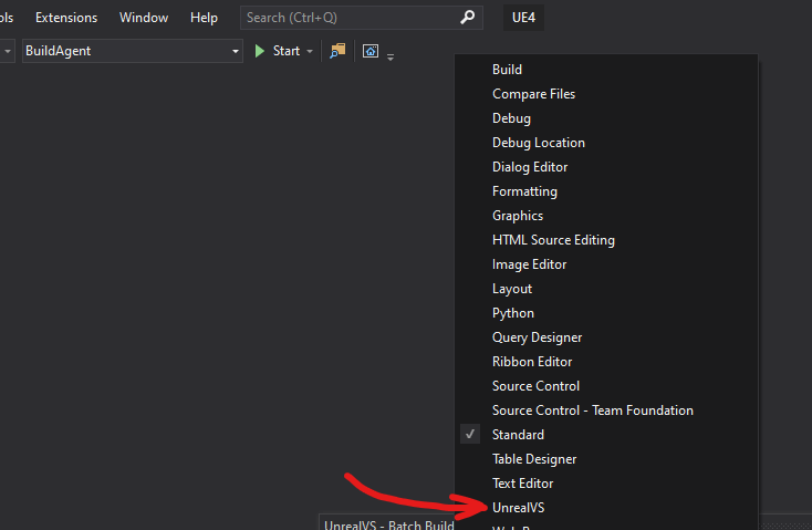 PathToUnrealEngineRepository\Engine\Extras\UnrealVSand install the UnrealVS extension appropriate for your installation of Visual Studio. - Once installed you can go back to the root of the repository and open up the project in Visual Studio with the