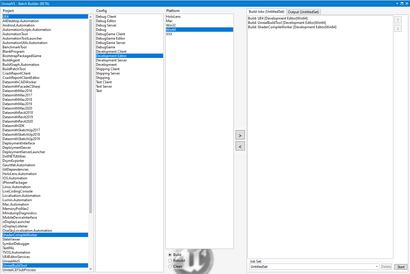UE4,ShaderCompileWorkerandUnrealBuildToolby control-clicking them so you individually select those. Then selectDevelopment Editorin the Config view and lastly select Win64 as the platform.